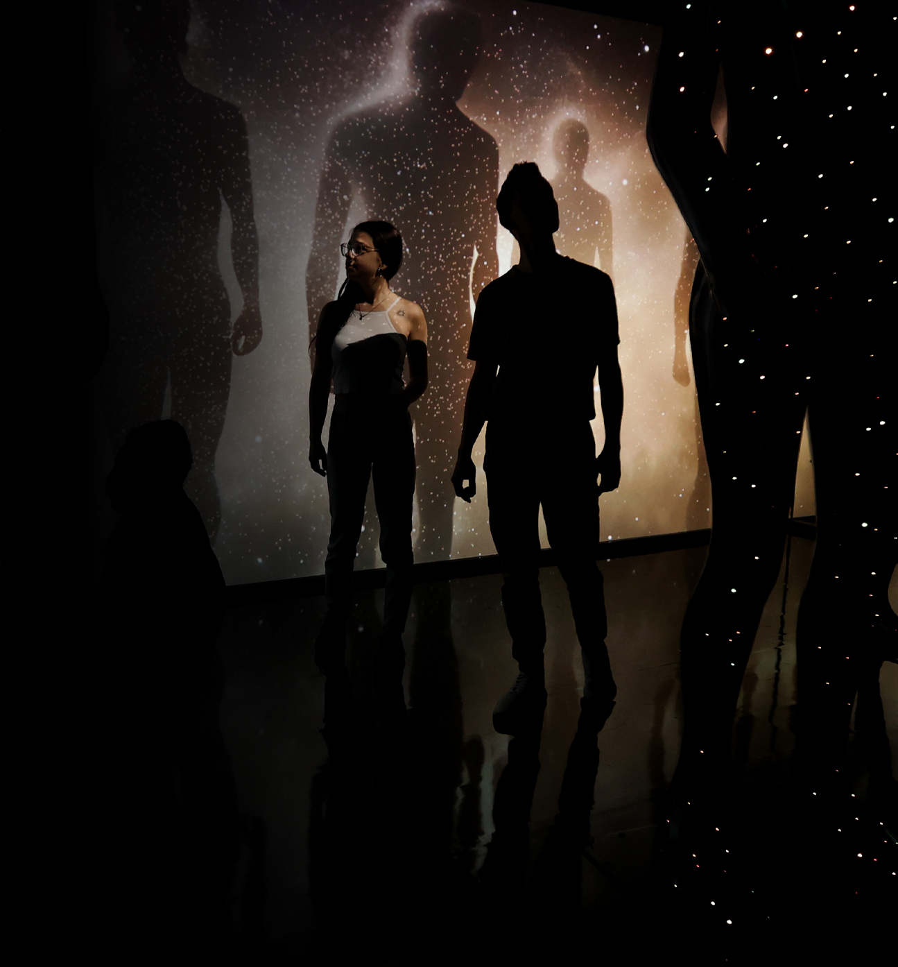 Behind them, a vast wall shimmers with projected silhouettes of celestial