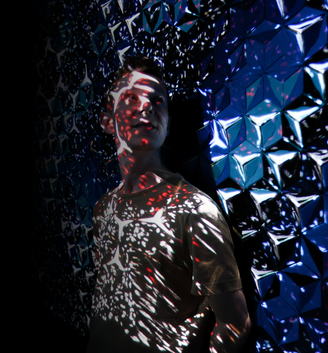 The installation originates from the hidden connection between geometry and nature - the idea that every organic form contains underlying geometric structures, and that even the simplest shapes can build a living, continuously evolving system. Light layered onto the static material structure sets the form in motion, expanding the spatial composition into a temporal dimension. Through the interaction of matter and light, a constantly shifting visual system emerges, evoking transformation and cyclicality. The mosaic-like elements function as abstract visual fragments that, under certain lighting conditions, briefly assemble into a recognizable form before dissolving again. Within the Memento Mori context, the skull appears as a structural reference rather than a personal symbol - a form that outlives the body yet carries no individual narrative. Its cyclical emergence and disappearance reflects impermanence and continuous transformation, reminding us that time is not linear, form is never fixed, and everything that comes together will eventually fall apart.