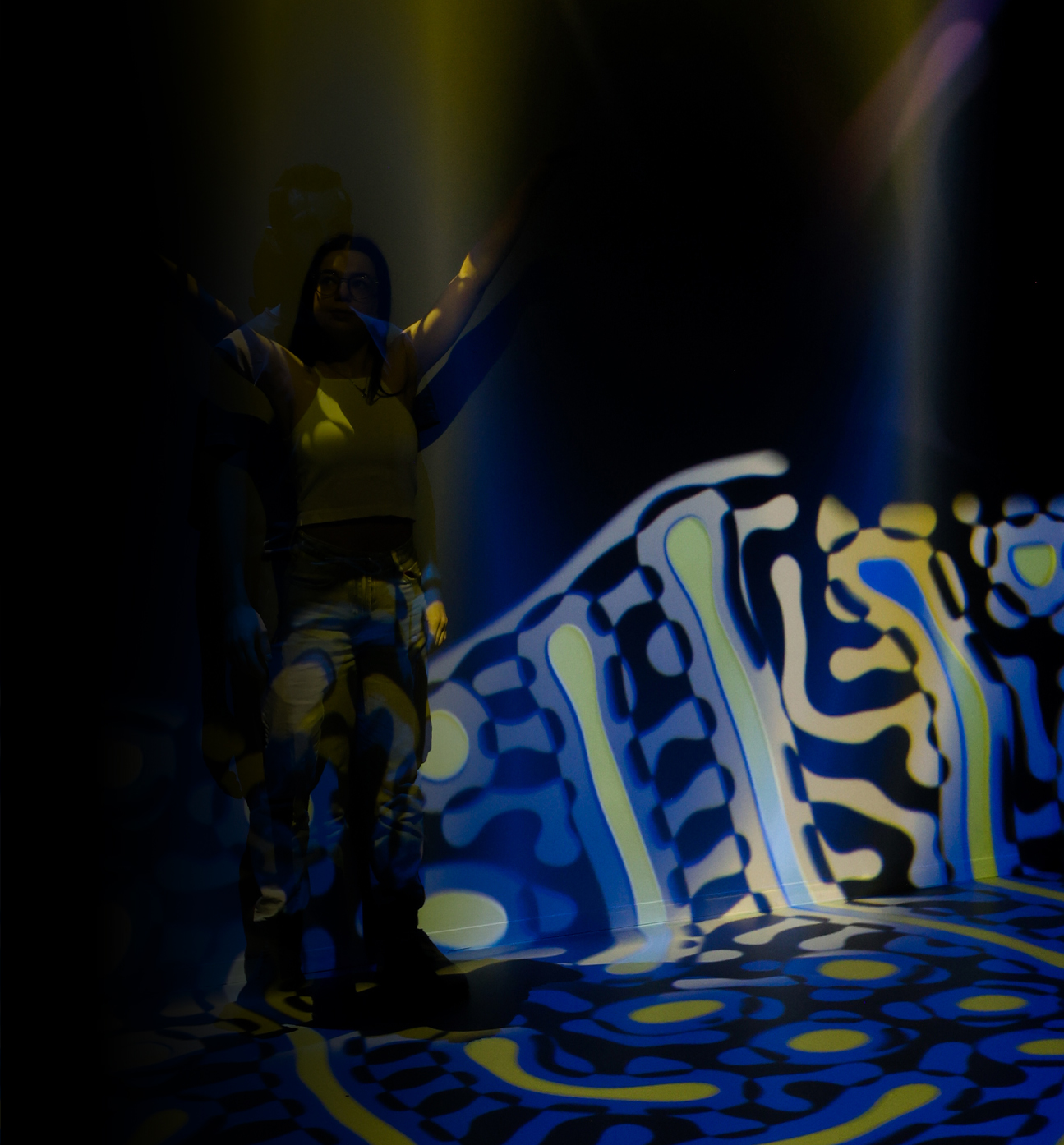 Nexus is a transitional space where reality becomes its own reflection and form dissolves into light. At the heart of the installation stands a transparent mirror—a threshold between dual worlds. On either side, projected animations shift between harmony and contrast: mirrored movements, inverted imagery, and complementary colors dance across the surface. What the viewer perceives is not fixed—it hovers in the liminal, between what is seen and what is sensed.
