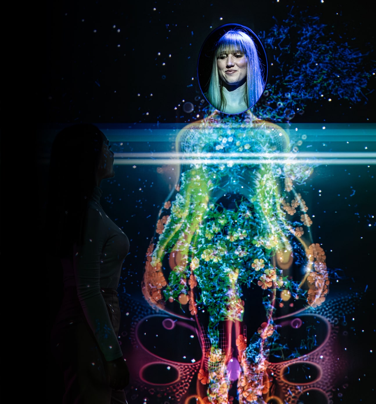 SOULSCANNER is an immersive video installation that captures audiences with visuals reminiscent of an x-ray scanner but with a metaphysical twist: rather than meat and tissues, Soulscanner reveals the auric and astral dimensions of its participants. As visitors move within its sensory field, their outlines are illuminated in shifting hues, representing various states of energy and emotional resonance. interactive algorithms translate the participant into a dynamic display of colors and patterns, mapping ethereal qualities like aura layers and emotional vibrations in real-time. The installation invites self- exploration, encouraging viewers to reflect on unseen aspects of their inner selves.